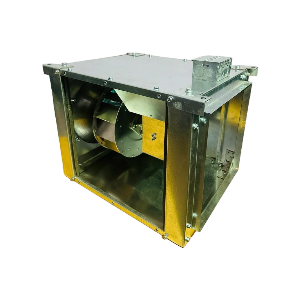Inlet and discharge duct collars are provided for easy duct connection. The square design provides a larger discharge area than tubular centrifugal and vane axial fans; outlet velocities are reduced for quieter operation.